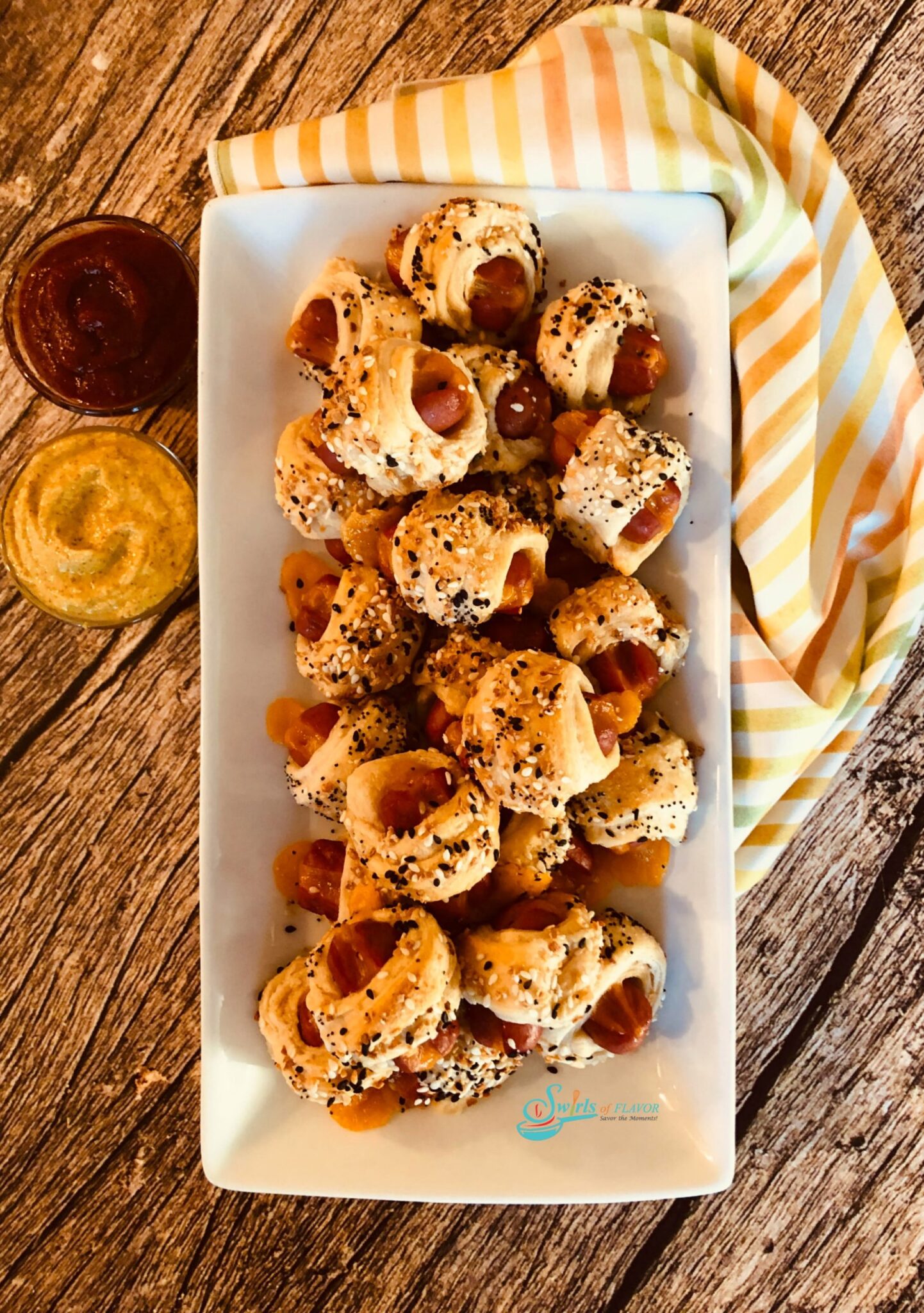 Stuffed with cheddar cheese, wrapped in crescent roll dough and rolled in everything seasoning, we’ve taken the traditional pigs in blanket appetizer recipe to a new level. Bet you can’t eat just one cheese hot dog!