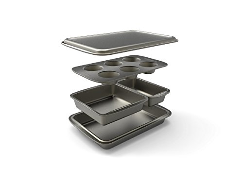 Introducing Baker’s Secret Easy Store Metal Bakeware. Bakeware designed for compact easy storage. Each shape of the Baker’s Secret Easy Store Metal Bakeware conveniently fits inside the next larger size, so your bakeware pans will take up less space than ever before. Baker’s Secret Easy Store 5 piece set includes; 6 cup Muffin Pan, 9in x13in Oblong, 8in Square Cake Pan, Medium Loaf Pan, Small Cookie Sheet.