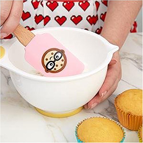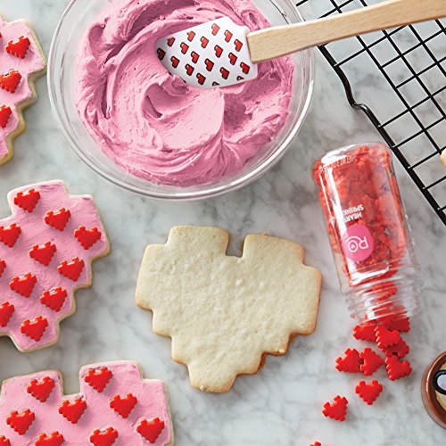 Includes two silicone spatulas, 8-bit heart comfort grip cookie cutter, oven mitt, one bottle 3 oz. (86 g) 8-bit heart sprinkles