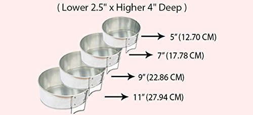 Contains 4 Pans: 5″ (12.7cm), 7″ (17.78 cm), 9″ (22.86 cm), 11″ (27.94 cm) – (all lower 2.5″ ( 6.35 cm) x higher 4″ (10.16 cm) Deep)