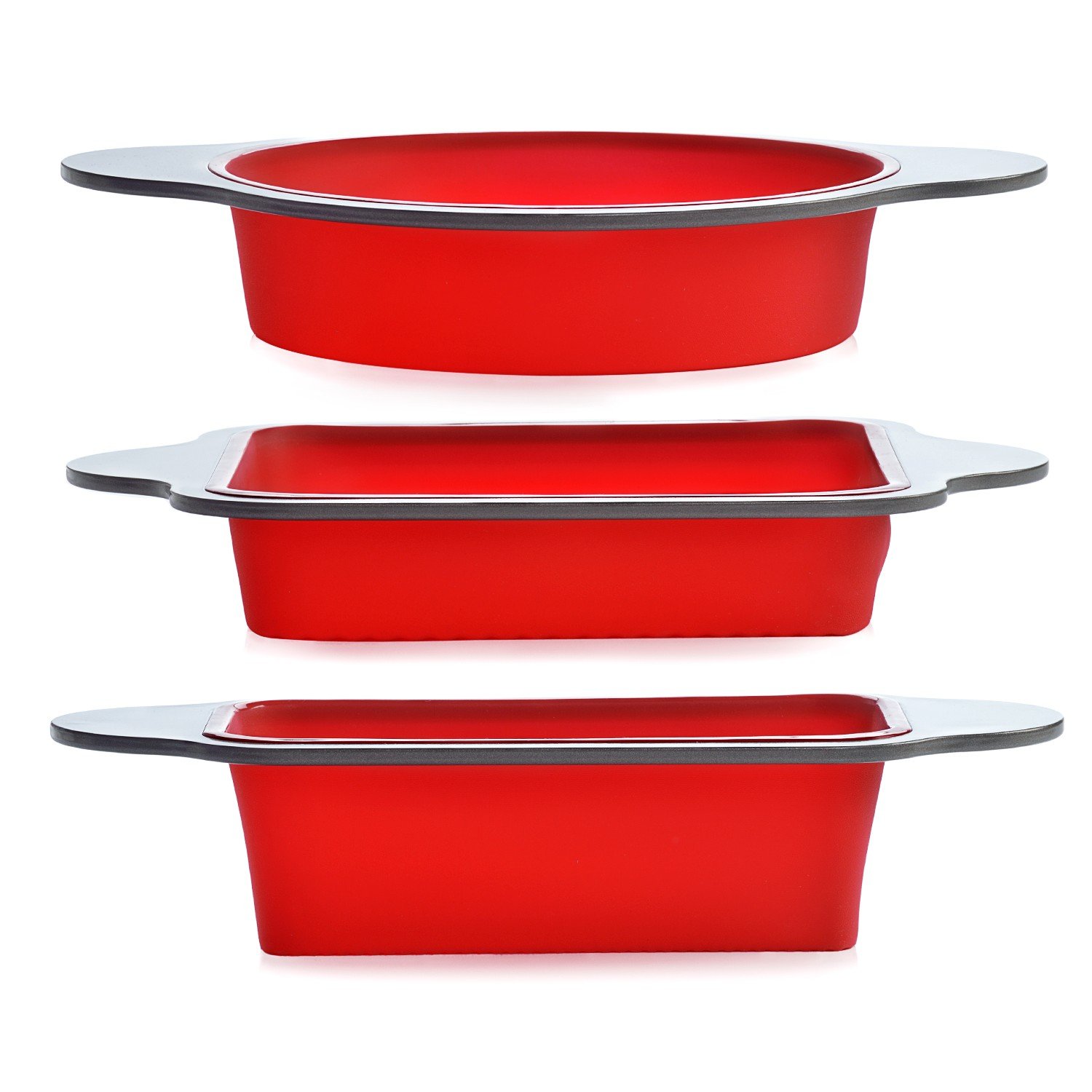 The 3-Piece Non-Stick Silicone Cake Mold Baking Pan Set by Boxiki Kitchen is made from genuine FDA approved food-grade silicone, BPA-free and completely non-toxic. This ultra-advanced material is odor and stain resistant, looks and works good as new for many years. Replace your old metal pans with these amazing hi-tech cookware pans – the perfect kitchen gift!