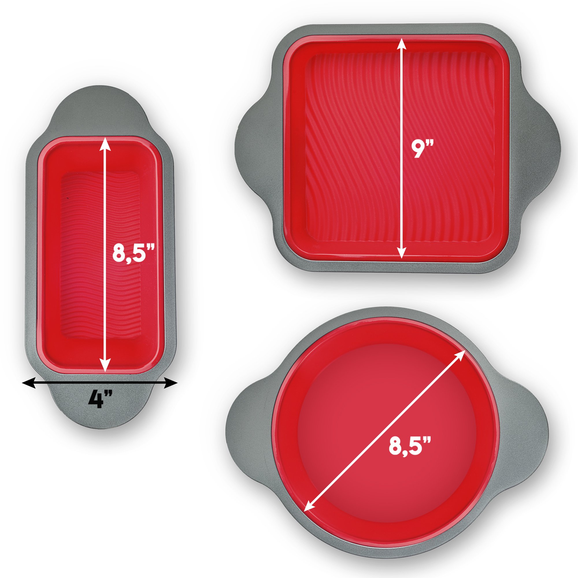 INNER DIMENSIONS – Square cake pan 8.5″ long x 8.5″ wide x 1.75″ deep, round cake pan 9″ x 2″, bread loaf pan 8.5″ x 4″ x 2.75″