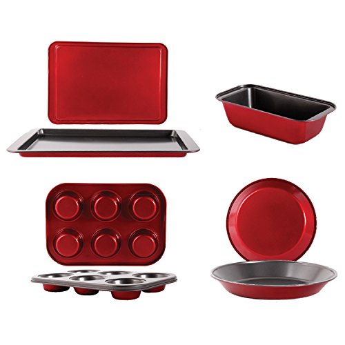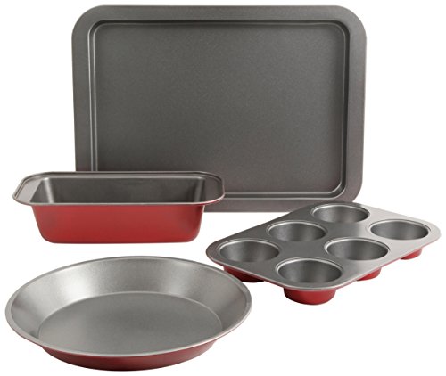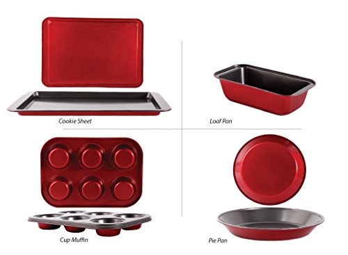 Set includes one 13.25-inch by 9.25-inch Cookie Sheet, one 8.5-inch by 4.25-inch Loaf Pan, one 6 cup Muffin Pan, and one 9.25-inch Baking Pan