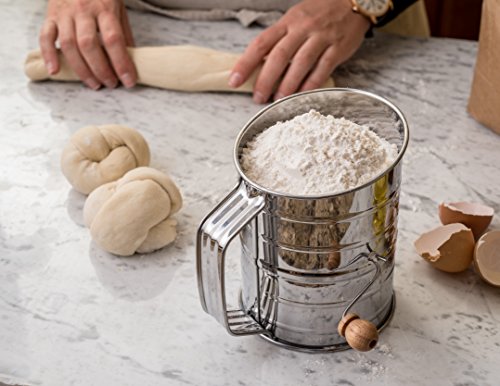 CLASSIC RELIABLE HAND CRANK AND SINGLE MESH: Professionals prefer crank-style sifters over hand squeeze sifter models because they can stand up to repeated use without tiring out your hand. Sifting is effortless and clean up is super simple – no multi-layers of mesh for ingredients to get stuck.