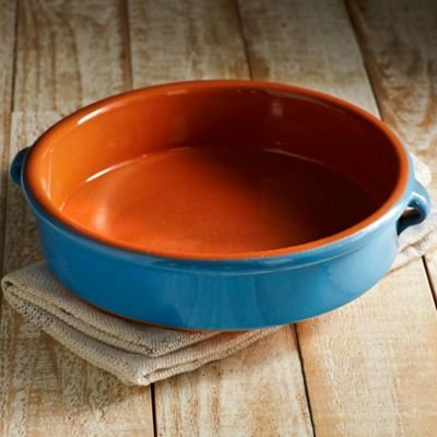 This beautiful cazuela dish will add a dash of color to your kitchen! Made of rustic terra cotta, it is ideal for cooking Spanish recipes such as gambas al ajillo (garlic shrimp), and is just as useful for roasting chicken or potatoes. Each cazuela has a bright blue glaze, and will add a cheerful accent to your cookware collection. We use our cazuelas as a go-to dish in the kitchen, great for cooking hot dishes or as a serving dish for any kind of tapa or snack. Artisans craft these beautiful dishes in the town of Breda, near the Pyrenees Mountains, as they have since Roman times. The sturdy terra cotta holds heat, perfect for keeping meals warm even after it is brought to the dining table. The glaze on the cazuela is safe for all applications and contains no lead. How to Cure Your New Cazuela for Cooking: If you are planning on cooking with your cazuela, you will need to soak and cure it using the following directions. Soak the entire dish in water to cover for 12 hours. Drain and wipe dry. Rub the unglazed bottom with a cut clove of garlic (we are not sure how the garlic works, but why argue with tradition?) Fill the dish with water to 1/2 inch below the rim, then add 1/2 cup of vinegar. Place the dish on a flame-tamer over low heat and slowly bring the water to a boil (no flame tamer? Crumple a sheet of aluminum foil and create a ring that you place over your burner to create about an inch of space between the heat and the cazuela). Let the liquid boil down until only about 1/2 cup remains. Cool slowly and wash. Your cazuela is ready for use – the garlic has created a seal. This technique has been used since the Middle Ages. It seasons the pot and hardens the unglazed parts. To clean, soak in sudsy water and scrub with a soft brush to remove any hardened food. If you have not used the cazuela for an extended period of time, you may need to re-cure it before use.