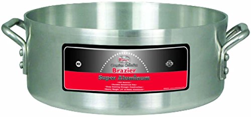 Winco AXHB-24, 24-Quart 18″ x 5-5/8″ Professional Extra-Heavy Super Aluminum Brazier Pan is a versatile and reliable cookware, perfect for braising, simmering and slow cooking of meat and vegetables. Thanks to its reinforced aluminum construction the pan is extremely durable and provides great temperature circulation. Brazier pan dimensions: 18″ Dia x 5-5/8″H. Capacity: 24 Quarts. Thickness: 6.0 mm / 1/4″. Due to its extra-sturdy handles, this pan provides a comfortable and secure grip even when wearing oven mitts. Moreover a fitting lid makes cooking healthier by preserving nutrients in your meal. The item is NSF approved.