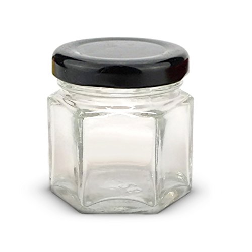 STRONG HEXAGONAL GLASS is food grade and dishwasher safe. Available in 7 different color lids, each 1.5 oz jar is 1.75 inches wide, 2 inches tall and holds 45 ml, equivalent to 7.5 tsp. or 2.5 tbsp, ideal for storing samples or gifts
