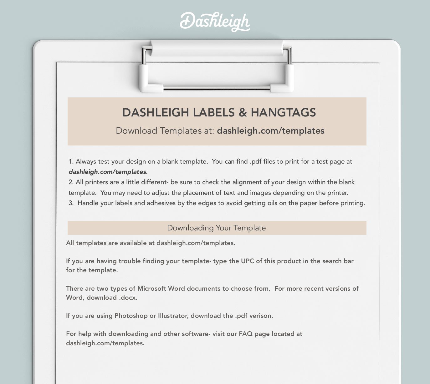 At the Dashleigh template center, you will find instructions for using Canva online software with our labels. Canva is a free online software that includes thousands of graphics, fonts and images, and makes designing a attractive label easy. However, if you are interested in creating a template on your PC or Mac you can use over and over, we offer templates for Microsoft Word, PDF for Photoshop and Illustrator, Open Office or Apple Pages, all available for download at the Dashleigh Template Center. Your download instructions will be found on the sheet label packaging, or by going to the Dashleigh website.