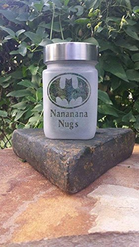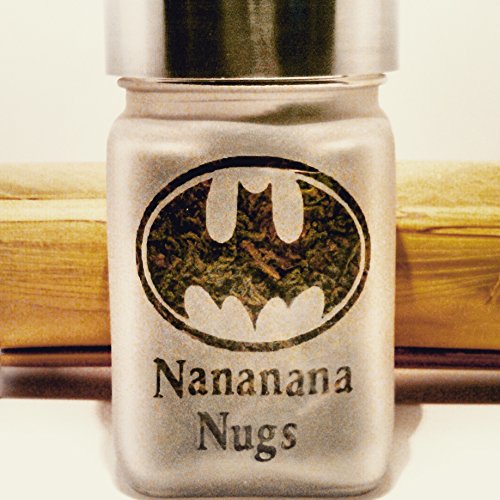 Weed stash jar with Bat and Nocturnal Nananana Nugs design. Stash jars make great cannabis gifts, weed gifts for you or your favorite stoners birthday, holiday gift. Nocturnal Nanananana Nugs weed jars will keep your herb and nugs fresh. Weed accessories by T420G are smell resistant, food grade, airtight etched glass with brushed aluminum screw on lid. stash jars size roughly 2.5″w x 3.5″T. Note: The Nocturnal Nanananana Nugs image in photo has a Green back drop. When it arrives to you, the logo will be clear glass. Other sides of the stoner accessories are solid etched glass. As a reminder, these are stash jars. If you are in a legal state, stash your weed. Medical Marijuana patient, stash your medicine. Non-Legal state, stash your herbs, money, tobacco, extra change, buttons, anything and everything you can imagine. Our stash jars are made of food grade glass with an air tight seal.