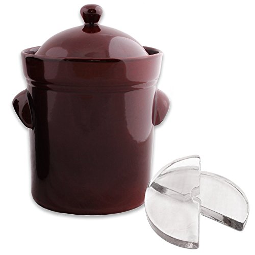 This fermenting crock comes with our exclusive non-porous Luna Glass Crock Weights (protected by US Patents D812,426 and 10,034,483 B2). The correct size of weight is essential in keeping the contents fully submerged in order to properly ferment. We also include a recipe for both pickles and sauerkraut with each crock we ship!