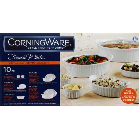 Corningware French White 7-piece set. Includes 1-each -1-1/2-quart round dish, 1-each -1/2-quart-glass cover, 1-each 1-1/2-quart-plastic cover, 1-each 2-1/2-quart-round dish, 1-each 2-1/2-quart-glass cover, 1-each 2-1/2-quart-plastic cover, 1-each 16-ounce-round dish. The recipe for a great dish starts, surprisingly, with a great dish! Corningware French White bakeware proves that when it comes to food preparation, few things are more convenient than baking and serving in one dish. With its classic, fluted design, French White oven-to-table bakeware imparts a traditional elegance that is a perfect complement to any décor. Versatile yet stylish, Corningware French White is simple, from start to finish!