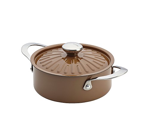A Rachael Ray Cucina Oven-To-Table Hard Enamel Nonstick 2.5-qt. Mushroom Brown Covered Round Casserole is a handy item to add to your cookware collection. Durable aluminum construction promotes fast, even heating on the stove and in the oven, while the nonstick interior releases foods effortlessly and makes cleanup a breeze. Double-riveted stainless steel handles offer a secure grip when carrying the casserole dish from the kitchen to the tabletop.