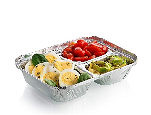 🍴 3 COMPARTMENT PORTION CONTROL FOOD PAN – This foil container has 2 small compartments and one large compartment. The smaller one can be used for salad and rice, while the large compartment can be used for meat or chicken. Dimensions: 8-11/16″ x 6-9/16″ Depth: 1-13/16″ Capacity: 23 fluid oz