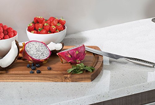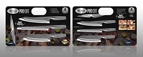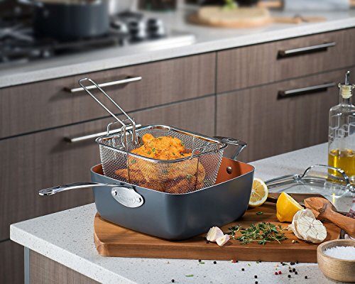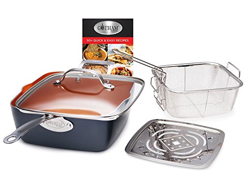 Gotham Steel Complete Kitchen Cookware and Cutlery Set Includes 4 Quart Stock Pot, Fry Pans, Knifes and More About the Product Gotham Steel is the first product of its class to actually utilize high-grade titanium and ceramic as surface finishing. This sophisticated combination not only ensures maximal durability it also allows for multi-fictional, all-around usage. Titanium plus Ceramic Coating FAQs High-heat threshold to sear perfectly browned steaks! Everything just slides right off, even burnt chocolate and cheese. Food flavor is not altered when cooking tomato-based or any acidic food products thanks to the ceramic component! The non-stick surface cleans easy! Versatile: for stove-top cooking, or baking! Rust-proof all overGotham Steel Pro cut is made with 100% Japanese solid steel, allowing you to slice through the toughest foods with ease. Combined with a non-slip Comfort grip handle and perfect balancing, Gotham Steel Pro cut will deliver perfectly precise slices every time-whether you’re cutting avocado, Pineapple, meat, bread, or anything else. With its specially designed scallops, you can even slice cheese without worrying about sticking! Set includes 1-9.5 inch Deep Square Pan, 1-Tempered glass Lid, 1-Steamer Tray, 1-Frying Basket, 1- 12.5 inch Pan 1- 9.5″ inch Pan 1- Recipe Book, 1 Chef knife, 1 Paring knife, 1 Bread knife, 1 Santoku stainless Steel pro cut knife.