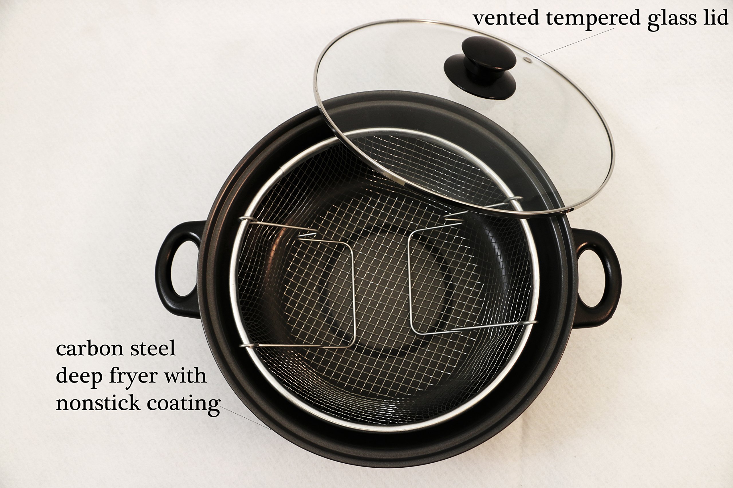 Constructed in long lasting carbon steel, this 11.5″ fryer comes with a nonstick coating makiing it easy to clean up. Also designed with a large handle for easy usage. The Glass tempered lid allows you to monitor your cooking while the stay cool Bakelite handle and knob provides comfortable use.