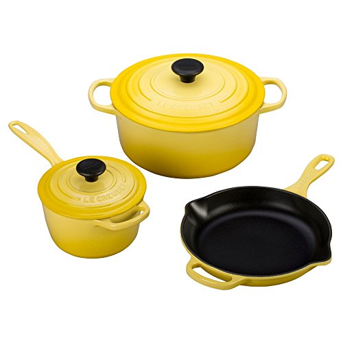 Start your cooking collection with the Le Creuset 5-Piece Signature Set. This starter set comes with a frying pan, Dutch oven, and sauce pan, as well as matching lids. It’s made of cast iron with chip-resistant enamel to ensure this set will last for years to come. The large handles provide a comfortable and secure grip. Pick from the available colors. Set includes: 5.5 qt. Dutch oven with lid, 1.75 qt. saucepan with lid, and skillet. Long-lasting, chip and crack resistant enamel exterior. Oven safe up to 500 degrees. Features large handles for a sure grip. Select from available color options. Dishwasher safe.