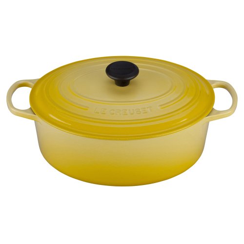 Sunshine-inspired! The Le Creuset 6.75 qt. signature Oval French Oven – Soleil is the color of sunshine and just as powerful. Its oval shape is ideal for searing and browning larger roasts before slowly cooking them to perfection. It’s made of cast iron because it’s the best at providing even heat yet this one has the lightest weight per quart of any premium cast iron cookware available. Ergonomic handles, an advanced enamel that won’t chip, and a perfect fitting lid add to the quality. This lovely oval French oven is safe for any heat source and is even dishwasher-friendly. About Le Creuset of America Inc. From its cast iron cookware to its teakettles and mugs, Le Creuset is a global standard of inimitable color and quality. Founded in 1925 in the northern French town of Fresnoy-Le-Grand, Le Creuset still produces enameled cast iron in its original foundry. Its signature color, Flame, was modeled after the intense orange hue of molten cast iron within a cauldron (or creuset in French), and has been a Le Creuset bestseller from the company’s first year to the present day. Though best known for its vibrantly colored cookware and original inventions such as the Dutch oven, Le Creuset has also forged a name as a creator of stoneware mugs and enamel-coated stainless steel teakettles. The style and performance of Le Creuset’s Cafe Collection and tea accessories are rooted in classic French cookware: bold colors, cylindrical loop handles, unmatched thermal resistance and heat distribution, and of course the iconic Le Creuset three-ring accent. Through its consistent qualities of authenticity, originality, and innovation, Le Creuset maintains a connection to both heritage and modernity. Soleil yellow enameled cast iron resists chipping or cracking. Sand-colored inner enamel prevents burning and sticking. Oval-shaped oven with oversized handles for a secure grip. Improved lid with built-in stabilizer seal and knob. 6.75-quart capacity.