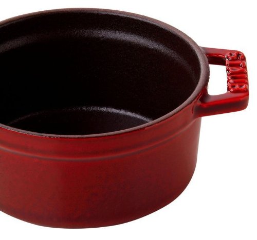 1102687 Color: Grenadine Features: -Round cocotte.-Nickel knob for oven use.-Closed circuit and spikes cooking allows self basting.-Enameled black matte interior provides genuine flavor.-Material: Cast iron.-Smooth enamel bottom.-Made in France.-Constant and optimum performance.-Cast iron retains and evenly diffuses heat.-Induction hob compatible.-Easy to clean.-Dishwasher safe but it is advised not doing this too often.-Resists up to 500 F.-Compatible with all heat sources.-Capacity: 5.5 qt..-Staub provides lifetime guarantee. Color/Finish: -Graphite finish. Dimensions: -Overall dimensions: 5.9” H x 15” W x 11.1” D.