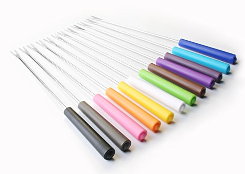 Set includes 12 stainless-steel forks with heat proof handles in various colors for easy identification