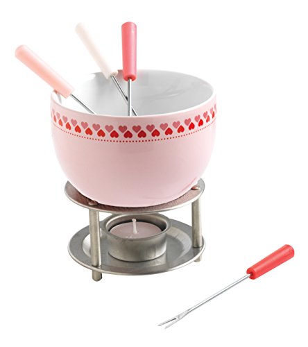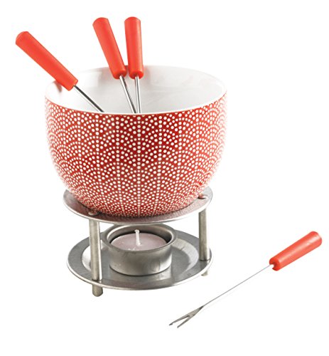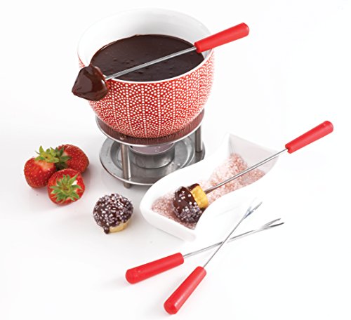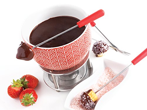 Classic chocolate fondue includes 4 stainless steel fondue forks, ceramic pot, tea light holder, candle and steel warming stand