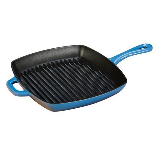 Cast from molten iron in individual sand molds and coated with porcelain enamel, this 10 inch square grill pan is perfect for grilling your favorite meats and sandwiches. The ribs insure that food does not sit in grease so it’s low fat cooking too. Use to sear, grill prepare panini sandwiches. The Lodge Color Square Panini Press is the ultimate companion to this ribbed Grill Pan. Cast iron has superior heat retention so it reduces the amount of energy needed for cooking. The Lodge Color Porcelain Enamel showcases vivid color and with ease of cleaning and resistance to abrasion. It’s also stain resistant. The Cooking surface is matte black enamel. Island Spice Red color.