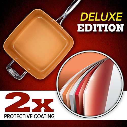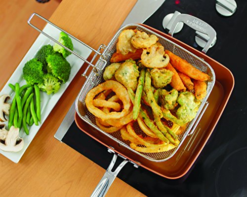 Pottella Deep Square 9.5” Nonstick Copper Pan Chef 5 Piece Set Frying Basket, Steamer Tray with Bonus World Cuisine…