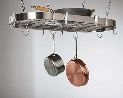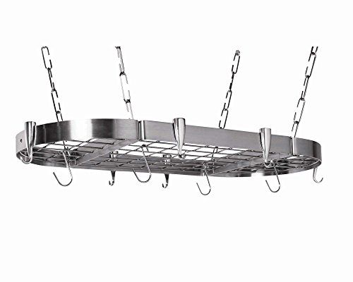 Concept Housewares, PR-40901. The Stainless Steel Oval Pot Rack 40”x20” mounts to the ceiling and has a heavy duty brushed stainless steel frame with a sophisticated shine. Cast aluminum pan hooks and the metal center grid complete the brilliant look. The center grid offers a place to hang hooks as well as acting as a shelf for additional storage or decorative display. This product is easy to install and includes all hardware needed to set up. Includes 32, 3” C-Links, (PR-41203), 10 Cast Aluminum Pan Hooks (PR-41208) and 12 S-Hooks (PR-41205). Additional hooks and links available.