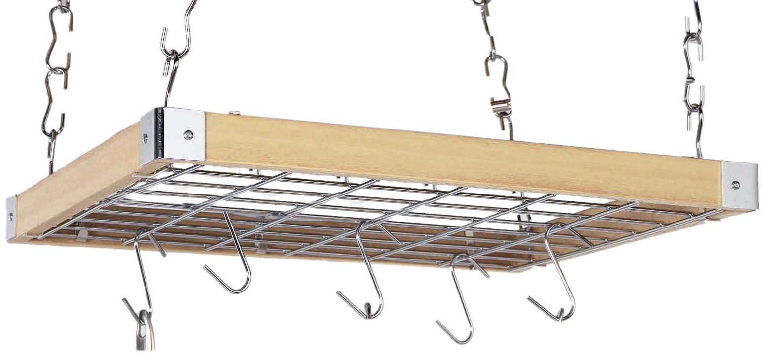This square ceiling pot rack provides efficient storage for all of your pots and pans. Ideal for use over your kitchen stove for rapid storage and elegant display. It also offers sturdy cast aluminum hooks suspended between a dual track system causing the hooks to slide or swivel into any desired position. This product is easy to install and includes all hardware needed to set up. With standard amount of hanging links this pot rack will hang 23-inch low.