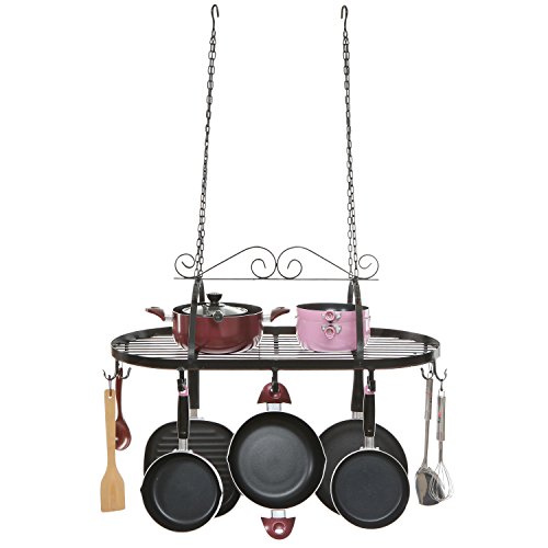 Organize your kitchen and prevent messes with this clever, space-saving cookware rack. Made of sturdy metal with a classic black finish and an elegant scrollwork design, this kitchen organizer is a stylish, durable, and dependable way to make use of an otherwise-unused part of your kitchen and transform it into convenient storage space. The 10 dual-hooks provide hanging storage for pots, pans, and kitchen utensils, and the oval-shaped platform is perfect for storing non-hanging items. Simply hang this rack from your kitchen ceiling using appropriate mounting hardware (professional mounting recommended), and you will be ready to modernize your kitchen and keep it clutter-free.