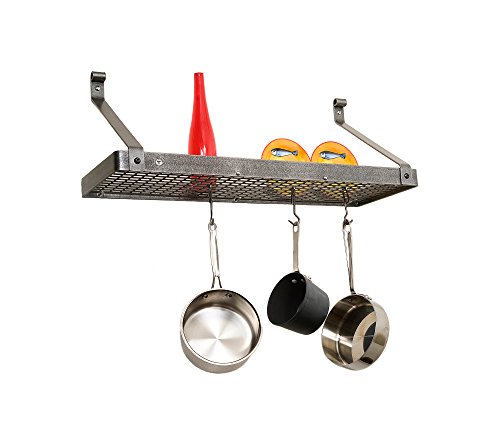 PR36 HS Elite Bookshelf rack – Hammered Steel. The Elite Bookshelf pot rack from Enclume mounts on the wall and comes with a grid for extra storage. Showing the more “subtle” side of Enclume Premier cookware racks, the “Elite” Bookshelf rack has a smoother, rounded look while maintaining genuine and durable Enclume quality. Our Bookshelf rack helps keep everything in one convenient place while you’re busy creating that special meal or dessert. Crafted of superior hot rolled, high carbon, steel. This rack is presented in Enclume signature “Hammered Steel” finish with a protective acrylic coating to deliver our expected beauty, durability and strength for lasting value and enjoyment. Fast, simple installation, with Enclume exclusive “toggler” Anchors. Install toggler instantly in standard Drywall. Holds hundreds of pounds. No need to locate joists or studs making installation a snap. All hardware necessary for assembly and installation is included. The pot rack comes with 6 straight (PHS) pot hooks, 6 angled (pha) pot hooks. 5 year limited warranty. Hand wrought by skilled craftsmen and proudly made in the USA. Shipping weight: 14 pounds. Measures 32″l x 10″W x 11.5″H.