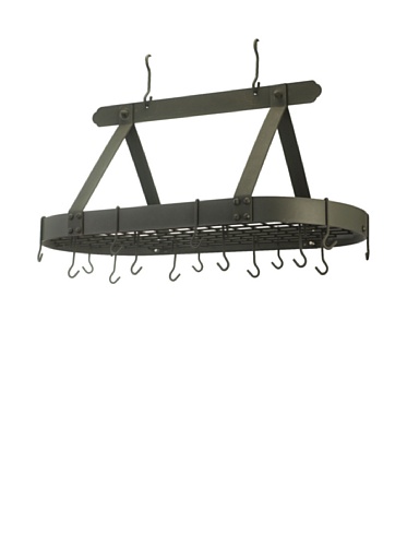 The Oval Pot Rack with Grid features an attractive ”A” frame suspension style and an oval frame. The center grid offers plenty of hanging options and can also serve as a shelf to store books, lids, or any other cooking necessities. This rack is made of steel and is available in several finish options. The hanging links are 16 inches apart. Graphite finish is pictured above. Center grid doubles as storage shelf. Steel construction with several finish options. Unique ”A” frame design.