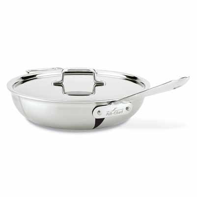 SautŽ, brown, and sear with the All-Clad D5 4-Quart SautŽ Pan. This classic pan’s large surface area and tall, straight sides prevent splattering and allow for easy turning with a spatula. As with all cookware from All-Clad’s D5 collection, this pan is constructed with bonded stainless steel for exceptional heating, especially in induction cooking. Its stick-resistant, 18/10 stainless steel interior and long, comfortable handle will make this an essential tool in your kitchen. It includes two riveted stainless steel handles and a lid.