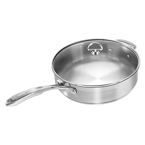 Rejuvenate your cooking routine with the Chantal Induction 21 Cookware 5-qt. Saut= with Glass lid. Featuring a dripless rim for clean, easy pouring, this pan is made from Japanese steel infused with copper, titanium and chromium for quick and even heat distribution, durability and corrosion prevention. Meanwhile, the tempered glass lid ensures easy monitoring of cooking progress and the ergonomic long handle and helper handle make cooking and serving safe and simple.