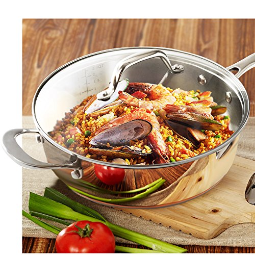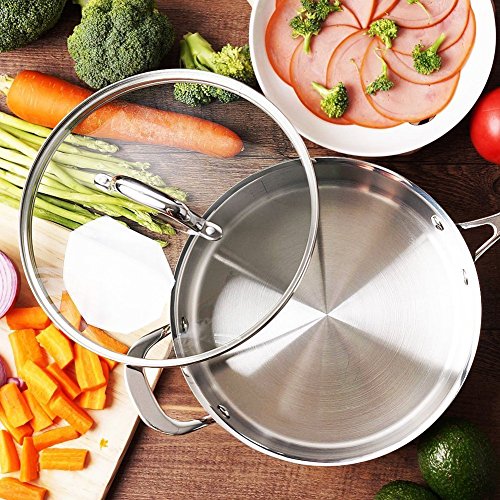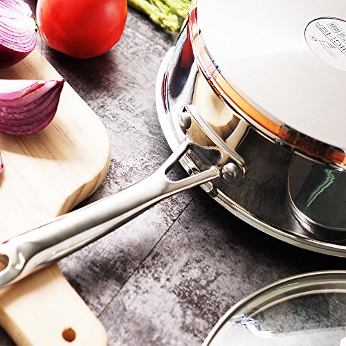 ADDITIONAL FEATURES – 5MM thick 3-Ply construction in the base (one layer of pure aluminum core sandwiched between two stainless steel layers) ensures optimal thermal distribution and storage, thus faster cooking, better nutrition, and more energy savings – Riveted stainless-steel handle stays cool on the cooktop – Flared rims ensure drip free pouring – Matte polished cooking surface for easy maintenance – Compatible with gas, induction, ceramic and halogen stovetops; Oven & Dishwasher safe.
