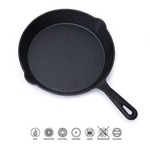 SUITABLE FOR: HUFTGOLD pre-seasoned cast iron skillets are suitable for all kinds of burners including gas, electric, ceramic, halogen, radiant, induction, oven and ranges fired by gas, oil, coal or wood. When finished cooking, wash with hot water and a sponge or stiff brush. (NOTE: cast iron pans are NOT intended to be used in a dishwasher and microwave)