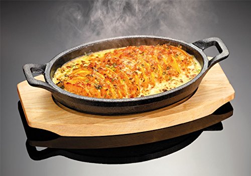 Durable Cast Iron Oven to Table Dish plus Heat Resistant Maple Wood Serving Stand.
