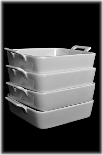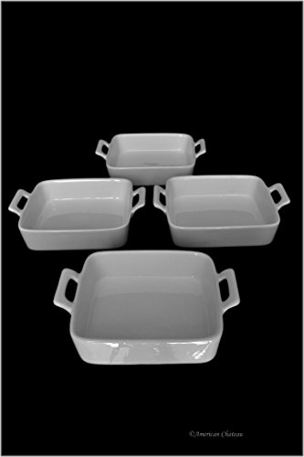 Set 4 Square Oven-Safe White Porcelain Casserole Au Gratin Dishes with Handles
