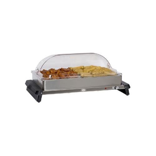 Cadco’s Buffet Server, double, countertop, 20-1/2″ x 14″ stainless warming surface, thermostat heat control, 155°-205°F, safety signal light, cool-touch handles, includes: (2) 2-1/2″ deep half size stainless steam pans, (1) clear polycarbonate rolltop lid, (1) removable stainless pan holder, (4) non-skid feet, stainless steel, 120v/60/1-ph, 2.5 amps, 300 watts, UL, cUL. One year warranty, contact factory for details, standard.