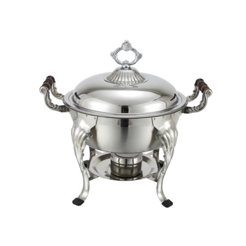 Winco presents its Crown Chafer (708) that is exclusively designed for formal occasions such as weddings, banquets, and engagement parties. Its finest quality and elegant details are perfect for your most descerning customers! It is made from stainless steel for utmost durability. Its capacity is: 5 quarts, and it is molded in a round fashion to display supreme class. Includes food pan, water pan, dome cover, and one fuel holder as well.