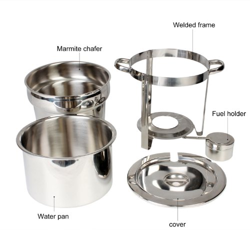 The set comes complete with the welded frame, water pan, fuel holder, cover, and marmite chafer.