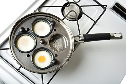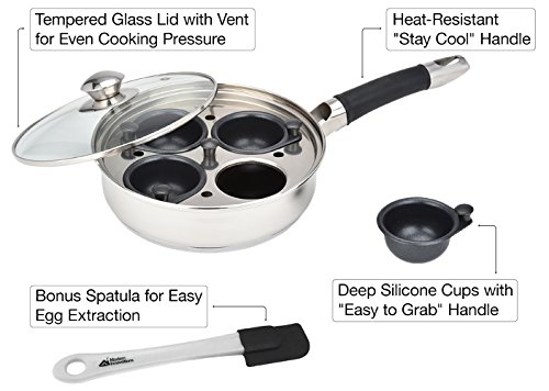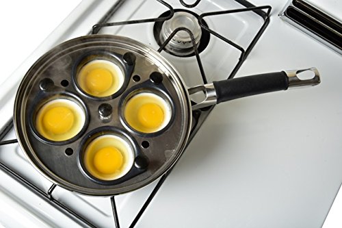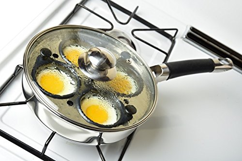 The 18/8 Stainless Steel Egg Poacher Pan Set with 4 nonstick Teflon-coated egg cups, would make for a great addition to your cookware collection. This exquisite stainless steel poacher set comes equipped with a 10-inch frying pan, stay-cool silicone handle for your safety and a tempered glass lid providing excellent ventilation and visibility while cooking your eggs. Poach your eggs to perfection in this all-in-one egg poacher.