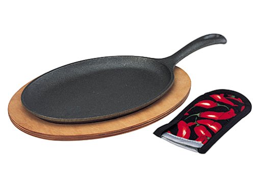 Includes 10-by-7-inch oval pan, wood base, and potholder