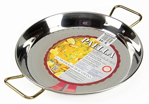 This is the ultimate paella pan. It is a work of art worthy of being displayed on your kitchen wall with its handsome gold plated handles. It is a wonderful gift – perhaps for yourself too! Because it is polished stainless steel the pan is virtually care free. Just wash it with soap and water and it is as good as new. There is no need to worry about seasoning, staining or any kind of rust. The pan bottom is dimpled in order to spread heat evenly. You can use this paella pan either in the oven, on top of the stove, or on an outdoor grill. This size pan makes enough paella for a dinner for four people —and what an attractive way to serve your creation