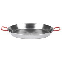 Used for centuries in Spain, the paella pan distributes heat evenly and becomes naturally seasoned with use. Safe for the oven, stovetop or outdoor grill. Note: pans over 18″ won’t fit on a standard stovetop. Made in Spain. Serving sizes: 13½” pan: 6 people; 15″ pan: 8 people; 17″ pan: 10 people; 22″ pan: 16 people. Care and Use of Paella Pan:First time use: Boil water in the receptacle.. Wash with water and detergent. Dry immediately. Never leave to air-dry.. The product is now ready to use; smear the interior with a light layer of oil to prepare it to better withstand the heat when cooking.. If you are not going to use the product straight away, lightly oil the interior and keep it wrapped in paper inside a plastic bag. Keep in a safe, dry place.. This type of product does not have a non-stick surface so that it is quite possible for food remains to become stuck. The easiest way to remove these is to fill the receptacle with soapy water and leave for at least an hour. This will soften the food remains. Then wash thoroughly with detergent and hot water.. When necessary, use hard scourers and scouring powder for cleaning the product.. When clean, lightly oil the receptacle both inside and out and keep it wrapped in paper inside a plastic bag in a dry, safe place.. This type of product has been devised for use on gas or wood-burning hobs.. Never put the receptacle on the heat when empty.. Avoid overheating the recipient.. If using in the oven, do not exceed a temperature of 250°C (480°F) nor a duration of 10 minutes.. Never use in a microwave oven.. Wooden and stainless steel implements may be used. Plastic implements are not recommended.. When in use, every part of the product will become hot. Please take great care and never leave the receptacle on the hob without responsible adult supervision. Keep well out of reach of children.