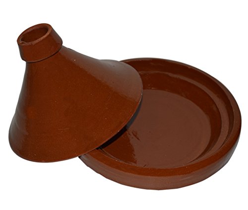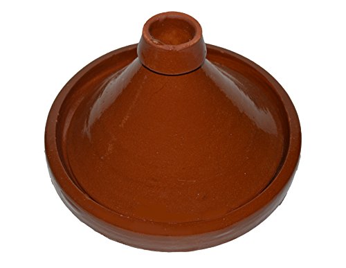 Simple and functional, this authentic, handcrafted Moroccan cooking Tagine is ready to be used for your next flavorful and exotic Moroccan meal.The Tagine is to be use on the top of electrical or glass stove or inside the stove. If you have a gas stove with flames please use a protective metal piece to protect your tagine from cracking. HOW TO CURE A TAGINE? It is necessary that it is seasoned before initial use. Please follow these simple instructions below for maximum results: 1. WATER: The new tagine needs to be first submerged in water for at least 1 hour. If you can’t submerge it, place it in a clean sink bowl and slowly fill the base of the tagine with water until it stops absorbing it. Place the tagine lid on top and fill it as well. Let stand for 30 minutes to allow full absorption of water into the clay. Empty excess water and set to dry for 5 minutes. 2. OLIVE OIL: All you need is 3 table spoons of olive oil, 2 for the base and one for the lid. Spread the olive oil throughout the base and lid with your hand. 3: HEAT: While the tagine is still wet with the oil applied to it, place it in the oven as shown in the first or second photos, and set temperature at 350 F and leave for 45 minutes. The evaporation of moisture creates a vacuum effect to pull the olive oil into the clay which glazes and seals it. Then leave the tagine cool down in the turned off oven.TAGINE MUST BE COOKED IN LOW TEMPERATURES AND A DIFFUSER IS RECOMMANDED TO AVOID BREAKAGE