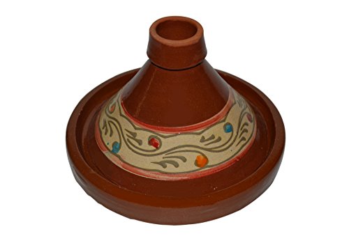 Simple and functional, this authentic, handcrafted Moroccan cooking Tagine is ready to be used for your next flavorful and exotic Moroccan meal.The Tagine is to be use on the top of electrical or glass stove or inside the stove. If you have a gas stove with flames please use a protective metal piece to protect your Tagine from cracking. HOW TO CURE A TAGINE? It is necessary that it is seasoned before initial use. Please follow these simple instructions below for maximum results: 1. WATER: The new tagine needs to be first submerged in water for at least 1 hour. If you can’t submerge it, place it in a clean sink bowl and slowly fill the base of the tagine with water until it stops absorbing it. Place the tagine lid on top and fill it as well. Let stand for 30 minutes to allow full absorption of water into the clay. Empty excess water and set to dry for 5 minutes. 2. OLIVE OIL: All you need is 3 table spoons of olive oil, 2 for the base and one for the lid. Spread the olive oil throughout the base and lid with your hand. 3: HEAT: While the tagine is still wet with the oil applied to it, place it in the oven as shown in the first or second photos, and set temperature at 350 F and leave for 45 minutes. The evaporation of moisture creates a vacuum effect to pull the olive oil into the clay which glazes and seals it. Then leave the tagine cool down in the turned off oven. The last photo shows a cured tagine ready for use.TAGINE MUST BE COOKED IN LOW TEMPERATURES AND A DIFFUSER IS RECOMMANDED TO AVOID BREAKAGE