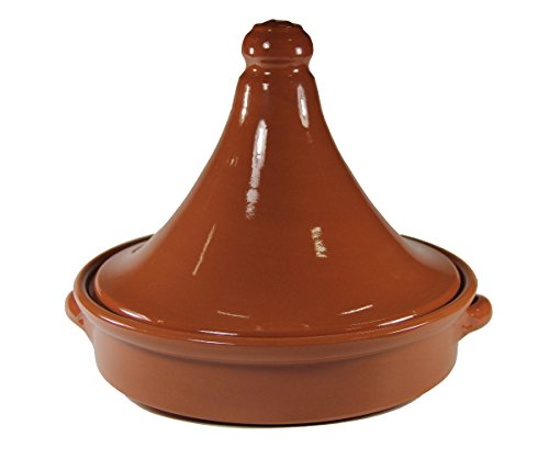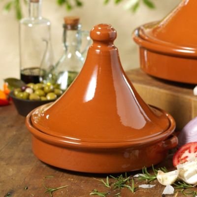 Explore the delicious flavor of the tagine! Spanish and Moroccan culture mixed for nearly a thousand years, and this traditional cookware is ubiquitous in the Berber country of Morocco. Tagine is the name of the cookware and the prepared dish, a slow cooked mixture of meats, fresh vegetables, olives and spices such as saffron, cumin and cinnamon. The unique shape of the tagine allows moisture to condense on the conical lid and drip back down into the ingredients, keeping them wonderfully moist and tender. There is a knob at the top of the tagine with a small ventring hole that makes removal of the lid very easy. Traditionally a tagine contains flavorful cuts of meat with a good amount of fat, such as lamb shanks or chicken, and the fat can be skimmed away later. Over hours the meat simmers with vegetables and spices until it is fall-off-the-bone tender. When the tagine meal is ready, it is served directly from the bottom dish of the tagine. Over time the terra cotta clay will pick up a patina, darkening with the cooking process. Before its first use, soak your tagine overnight. Coat lightly with oil and heat in a 300 degree oven for an hour or so (do not preheat the oven).