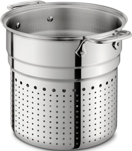 The stainless pasta colander insert is a convenient add-on to your All-Clad 7 quart stock pots. 2 riveted loop handles make it easy to prepare stock, and remove potatoes or pasta from boiling water. Perforations along the bottom and up the sides promote quick draining.