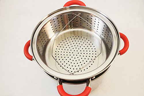 This multifunction cooker allows you to steam your favorite vegetables, cook pasta, and use it as a large stockpot. Encapsulated base provides faster and even heat distribution. Constructed in 18/10 Stainless Steel and induction stovetop ready. Now features silicone covered handles and knob for easy grip and stability when transporting a stockpot filled with food. Featured Red colors.