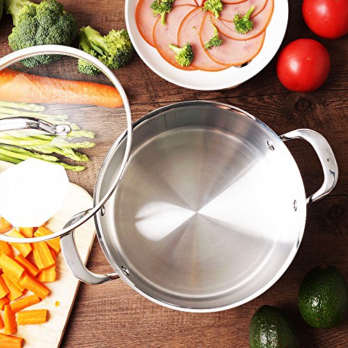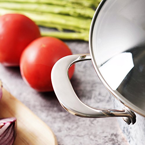 ADDITIONAL FEATURES – 5MM thick 3-Ply construction in the base (one layer of pure aluminum core sandwiched between two stainless steel layers) ensures optimal thermal distribution and storage, thus faster cooking, better nutrition, and more energy savings – Riveted stainless-steel handle stays cool on the cooktop – Flared rims ensure drip free pouring – Matte polished cooking surface for easy maintenance – Compatible with gas, induction, ceramic and halogen stovetops; Oven & Dishwasher safe.